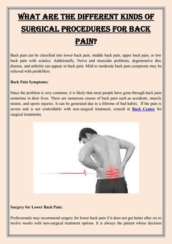Since the problem is very common, it is likely that most people have gone through back pain sometime in their lives. There are numerous causes of back pain such as accidents, muscle strains, and sports injuries. It can be generated due to a lifetime of bad habits. If the pain is severe and is not controllable with non-surgical treatment, consult at Back Center for surgical treatments.