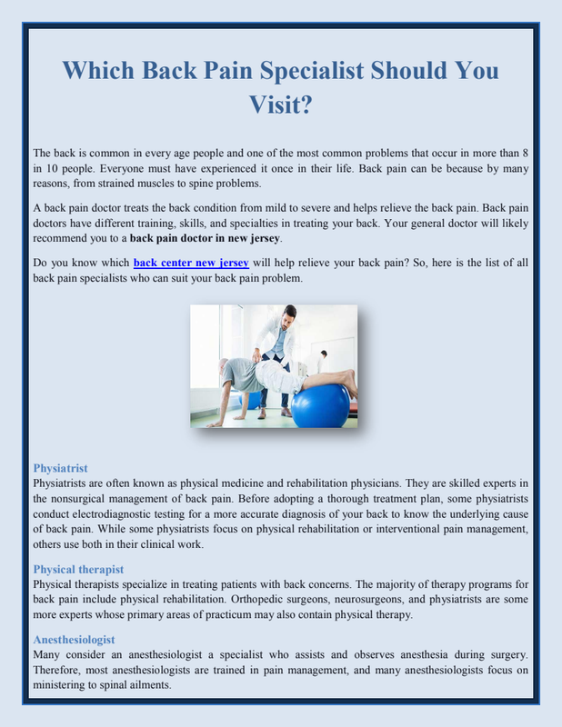 There was a high demand for a place where extensive and personalized care could be provided to patients with new and technologically advanced devices, and this demand was fulfilled by back pain centers with a team of highly proficient and experienced healthcare professionals. If you are undergoing back-related issues, do not delay the treatment; consult a back pain specialists new jersey for the best diagnosis and treatment.
