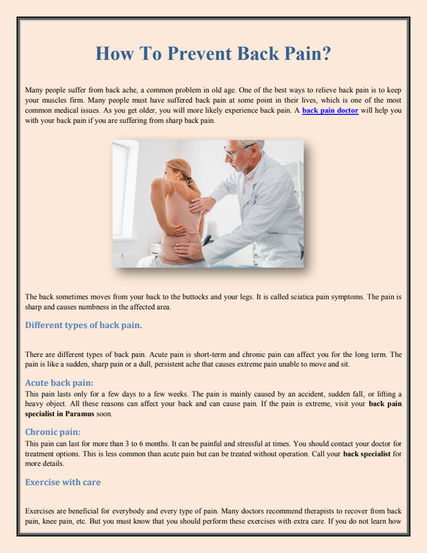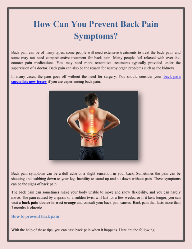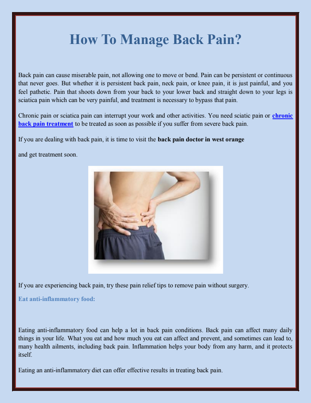 If you don't know the cause of the back pain, it is better to consult with a back doctor new jersey and discuss your symptoms and see the reason behind the pain.Let's see some of the nonsurgical treatments for chronic back pain:Keeping yourself active and moving is one of the best ways to keep your back pain in control. Exercise is one of the best foundations of chronic back pain treatment. Your back specialist may suggest this as the first treatment to try to treat back pain, but make sure you do physical therapy under the guidance of your physician. Each exercise is designed especially for the person with specific signs and conditions. Maintaining the exercise routine is essential to get good outcomes.