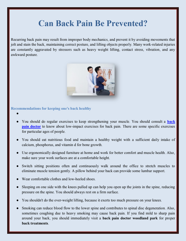 Take some rest for a while and let the Pain ease down. You need to take it easy, but dont take complete bed rest; this can make back inflexible. The best way is to keep yourself busy and tolerate the Pain only to a limit. Take a ride to the back pain specialists woodland park.If your back pain worsens. Many treatment options can alleviate Pain, but determining the cause of back pain can be complicated. Medications can prevent it from worsening if you just want to ease back pressure, relieve strain, protect your spine, and strengthen your muscles.Few changes in your daily habits can help you maintain a healthy, pain-free back for a long time. If your back pain is aching severely and lasts for more than two weeks, not allowing doing daily activities. You must see your family or a back pain doctor woodland park to confirm the Pain.If you are suffering from back pain, choose a clinic that is very familiar with your type of condition or the source of your back pain. Remember that the clinic uses a multi-disciplinary approach when you go through the process. A crew of clinicians and other health professionals will address all aspects of your pain.