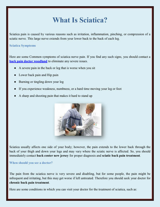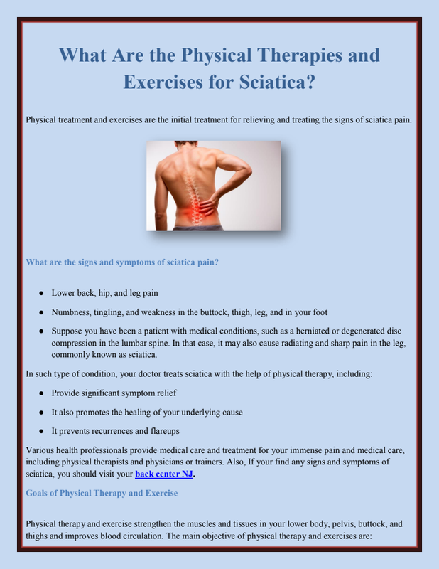 Commitment and experience contribute to successful treatment outcomes using physical therapy and exercise for sciatica. Sometimes your pain can't get relieved; your doctor prescribes some OTC medication or injections in such conditions. And you should contact the back center new jersey for diagnosis and better treatment of your situation.